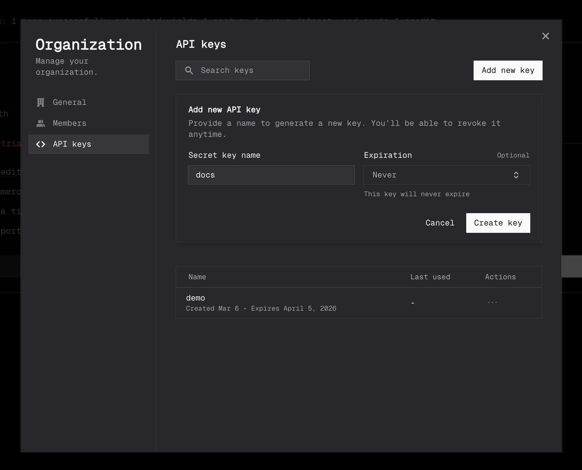 - Each key is scoped to one organization and cannot access other orgs' data