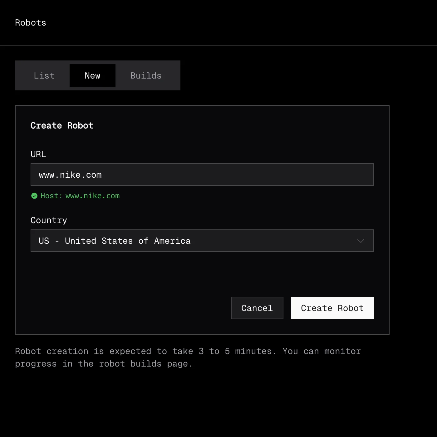 Creating a robot starts with a robot build. You provide a URL from the target site and a country code. Extralt's AI analyzes the site and compiles a crawler.