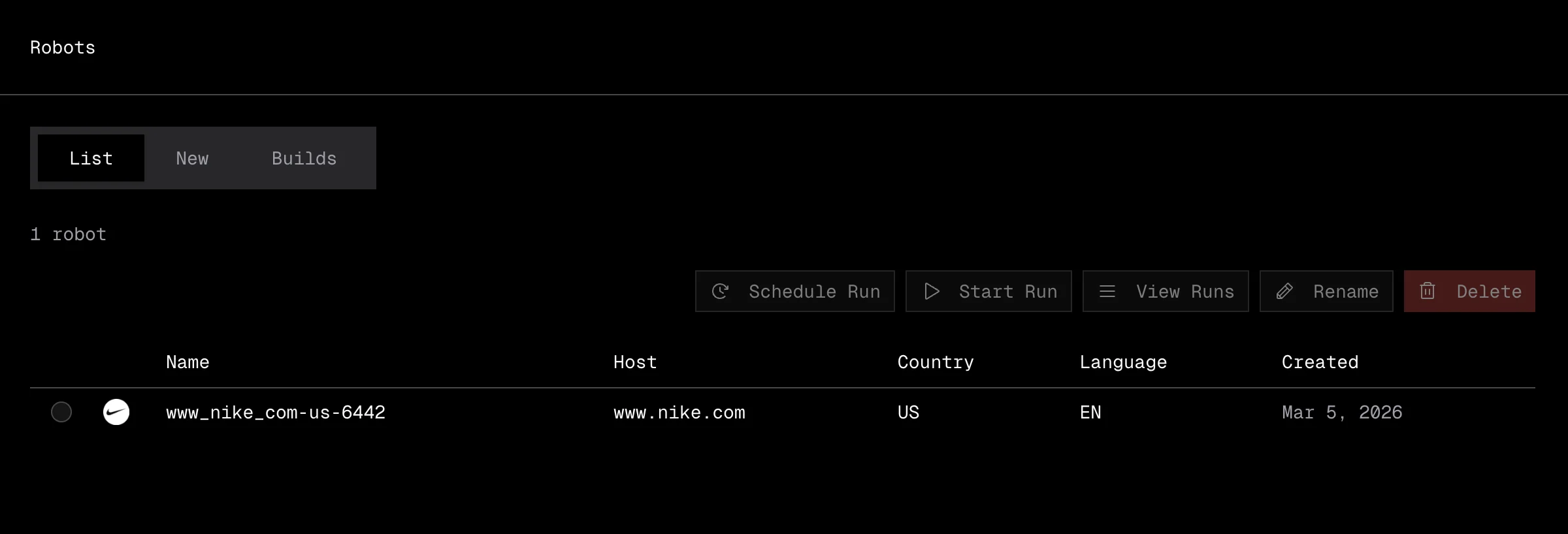 - Start Run: jump directly to creating a new run with this robot.