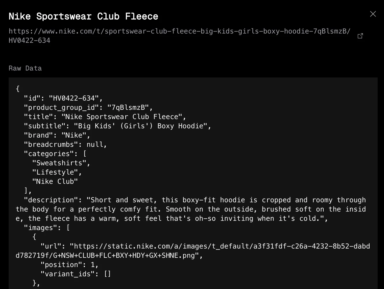 | 7 | 019cbcc8-f639-7620-ac93-8907be277cc9 | m5739en5f3pf86t8b234p9909h82av7m | www_nike_com-us-6442 | kh72tvgdng8nq5yma8pwwrtf0182b2br | brave-skink-7455 | https://www.nike.com/t/tech-mens-pullover-hood... | 1.772694e+12 | Nike Tech | {"id":"HV1342-437","product_group_id":"BmWkyVA... |