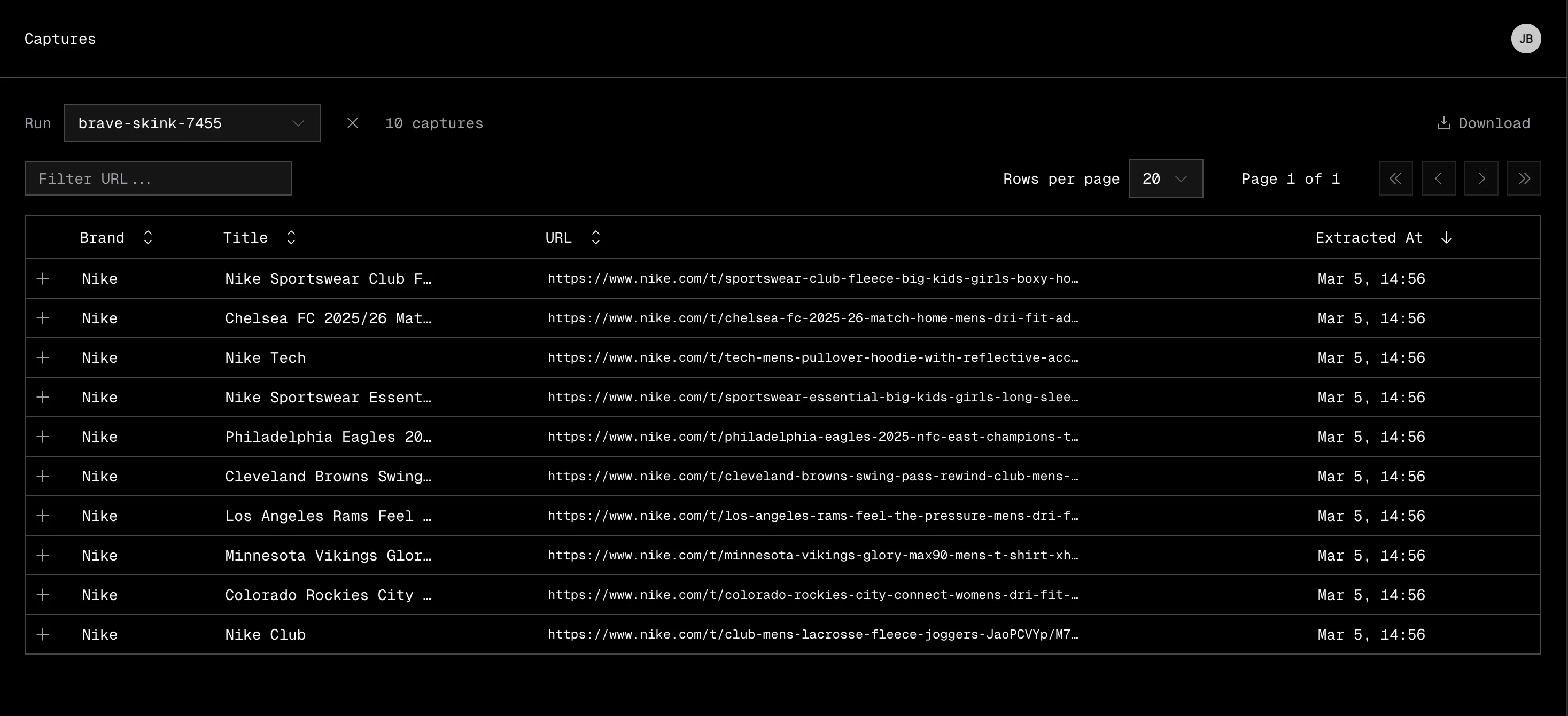 A capture is a single extracted data record. Each run produces one capture per successfully extracted URL, containing structured ecommerce product data.